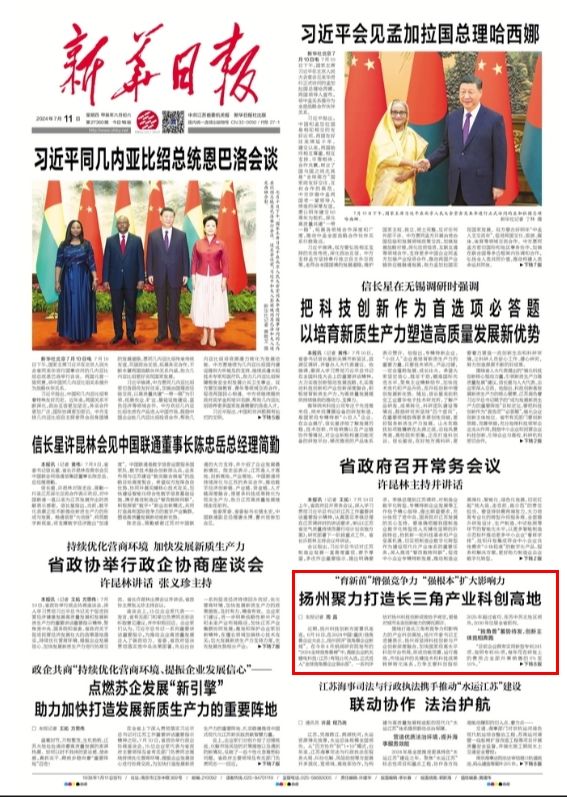7月11日,《新华日报》头版刊发报道《扬州聚力打造长三角产业科创高地》。现全文转发,以飨读者。
