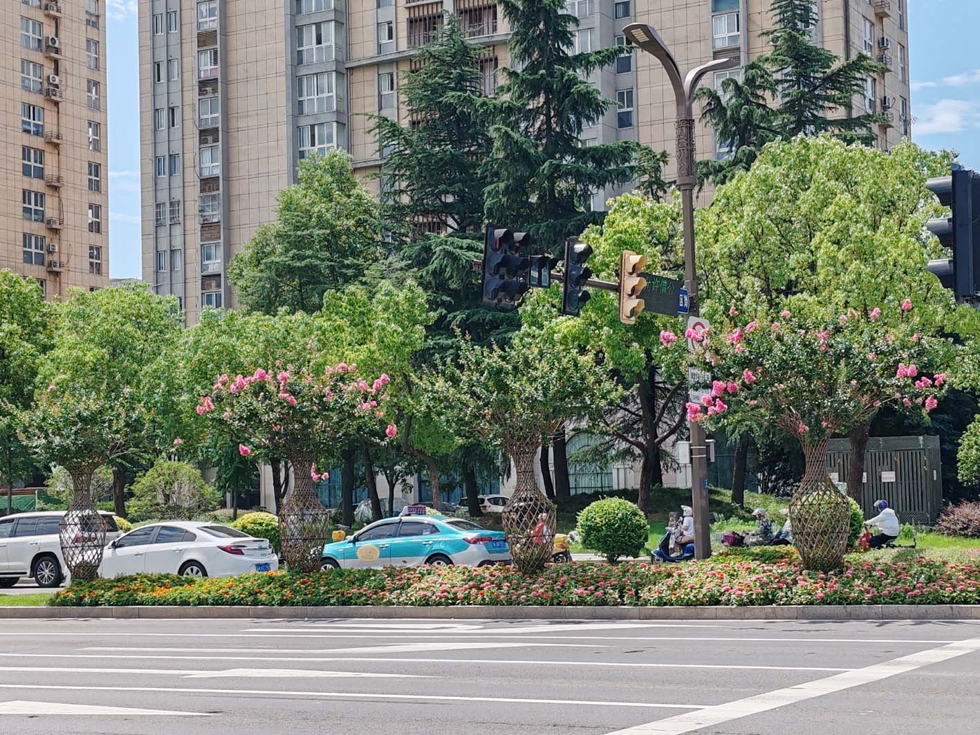 除文汇路外,文昌路上的紫薇树也是竞相盛开。在原琼花路路段,栽种在机非隔离绿岛上的紫薇树,有紫花、有红花,吸人眼球。而靠近润扬快速路机动车隔离绿岛上的紫薇树,则造型独特,被编成了花篮形状,让人眼前一亮。