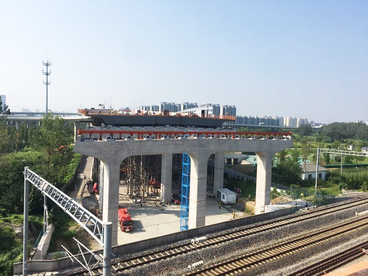 施工单位江苏雷威建设工程有限公司现场负责人介绍,施工现场采用的是载重260吨的架桥机,可满足跨径55米的大件作业。工程跨铁路箱梁共3跨,每跨14片箱梁,南北对称的两跨,每跨长27米,最大重量134.2吨;中间跨长45米,最大重量220.3吨。按照计划,9月底完成所有箱梁的架设后,10月底将实现整个桥梁的桥面贯通,11月底前将完成道路路基及部分路面施工,12月底前完成全部工程的施工,具备通车条件。
