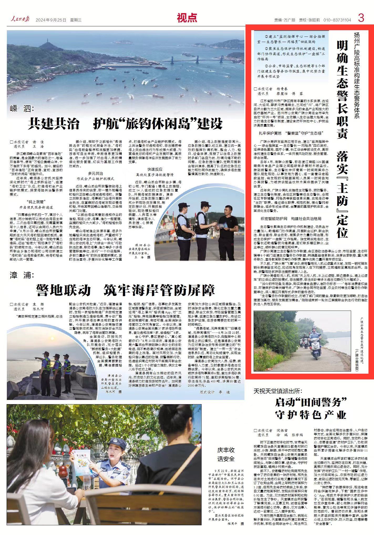 9月25日出版的《人民公安报》以《扬州广陵高标准构建生态警务体系 明确生态警长职责 落实“主防”定位》为题报道了今年以来,扬州市公安局广陵分局在全市率先启动“环洲一号”项目,主动融入生态治理大格局,全力打造生态警长制度,建设食药环快检中心,护航经济高质量发展。现全文转发,以飨读者。