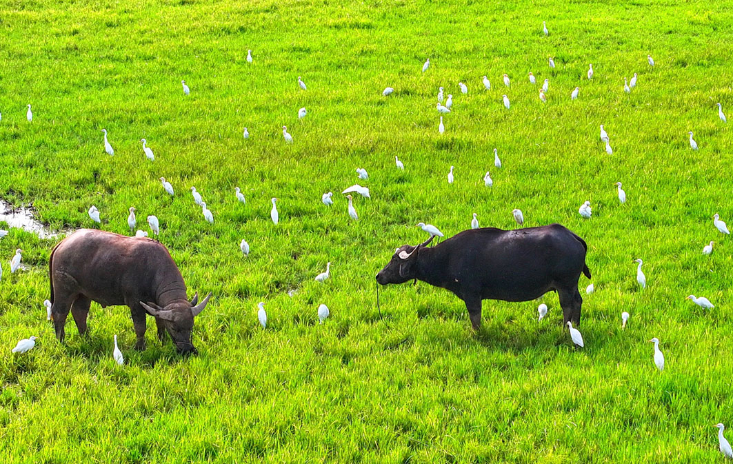 初秋时节,在仪征市经济开发区新城镇河畔,随处可见成群结队的白鹭在嬉戏觅食、翩翩飞舞,它们与耕牛相伴,构成一幅趣意盎然的田园画面。