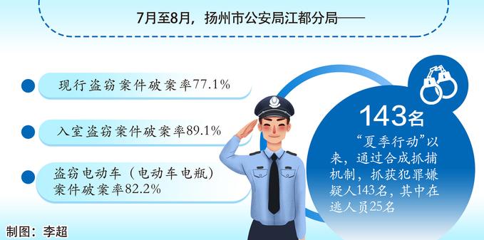 在夏季治安整治打击行动中,江苏省扬州市公安局江都分局紧盯多发性侵财案件,通过合成作战快侦快破,7月至8月现行盗窃案件、入室盗窃案件、盗窃电动车(电动车电瓶)案件的破案率,分别达到77.1%、89.1%、82.2%,其中盗窃案件24小时、48小时内破案率达56.1%和60.8%,群众高兴地说:“当天案件当天破,平安看得见。”