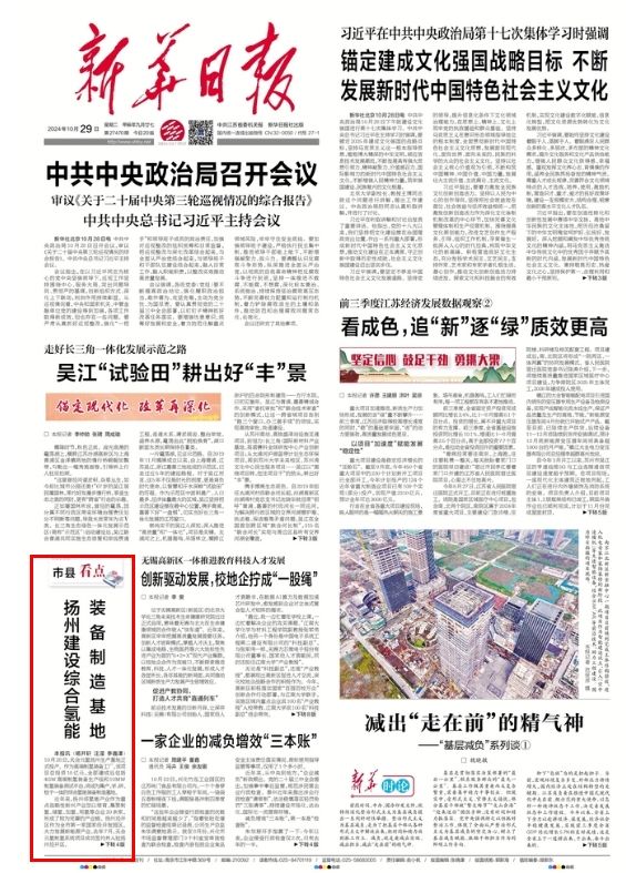 10月29日,《新华日报》头版刊发题为《扬州建设综合氢能装备制造基地》的文章,扬州发布现全文转发,以飨读者。
