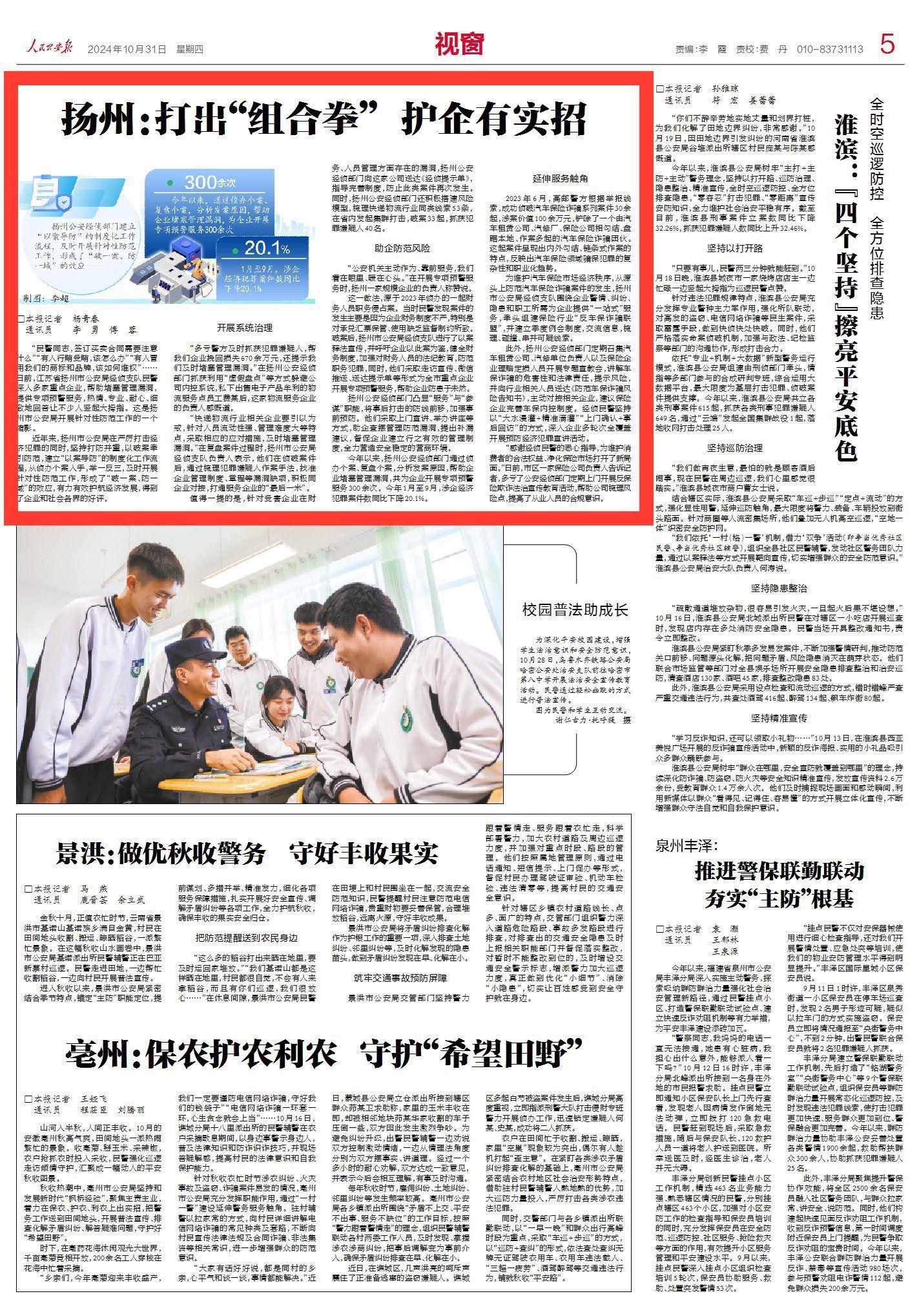 10月31日出版的《人民公安报》以《扬州:打出“组合拳” 护企有实招》为题报道了江苏省扬州市公安局经侦支队民警深入多家重点企业,帮助堵塞管理漏洞,提供专项预警服务,热情、专业、耐心、细致地回答让不少人竖起大拇指。扬州发布现全文转发,以飨读者。