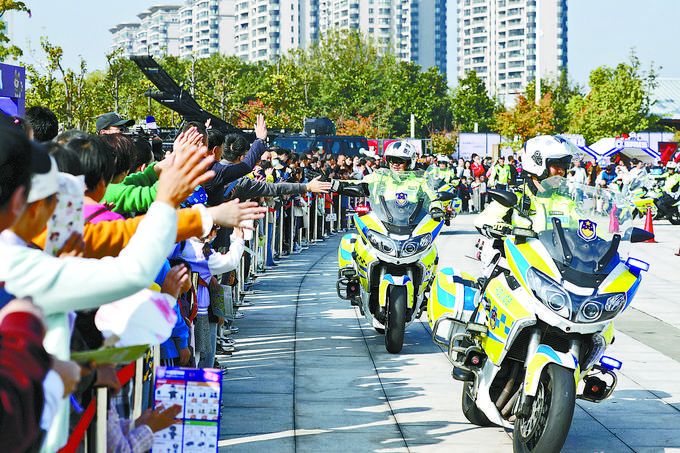 图为警务人员展示警用摩托车驾驶技能时与市民互动。沈冬兵 摄