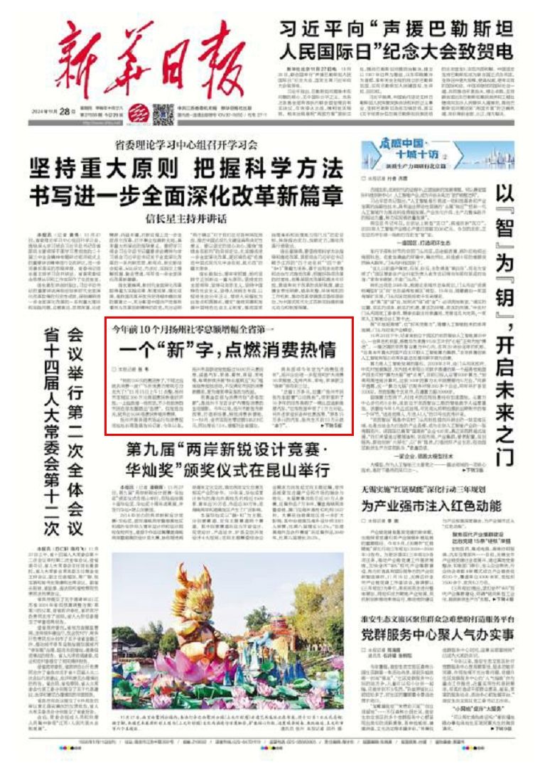 11月28日,《新华日报》头版刊发题为《一个“新”字,点燃消费热情》的文章,现全文转发,以飨读者。