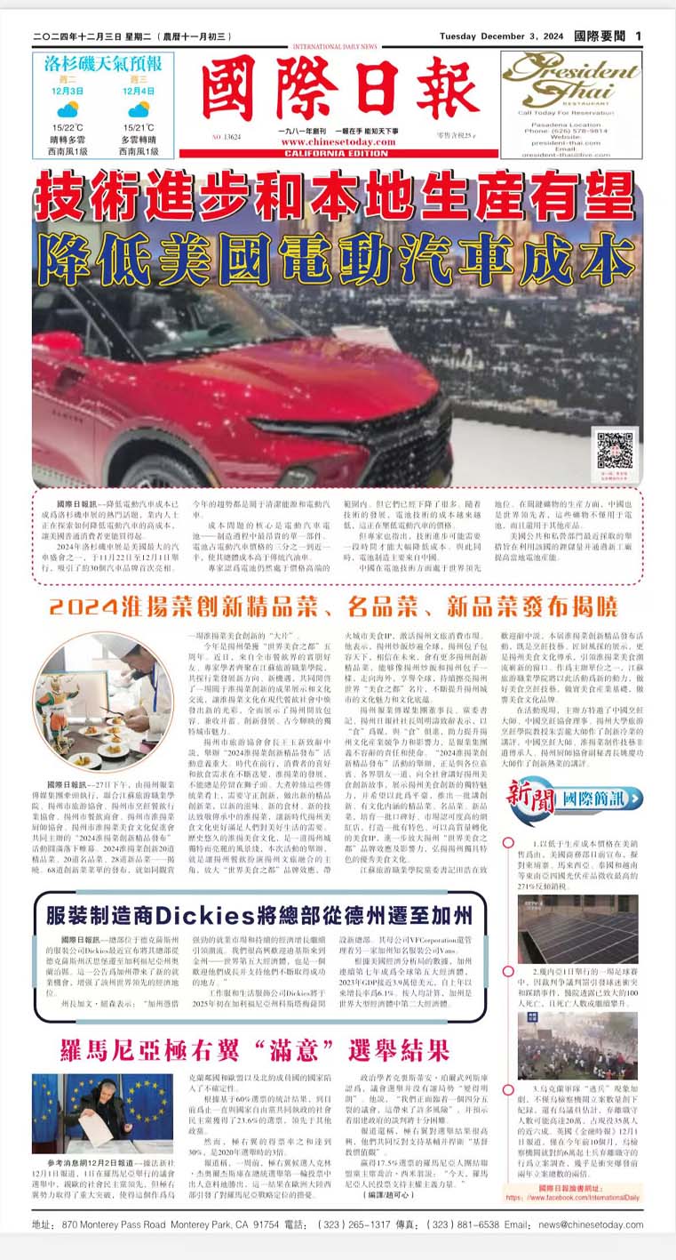 扬州网讯 (记者 孙炎) “2024淮扬菜创新精品发布”活动的成功举办,受到海外媒体关注。昨日,美国《国际日报》在头版显著位置刊发题为《2024淮扬菜创新精品菜、名品菜、新品菜发布揭晓》的文章,用大篇幅报道介绍了本次活动。