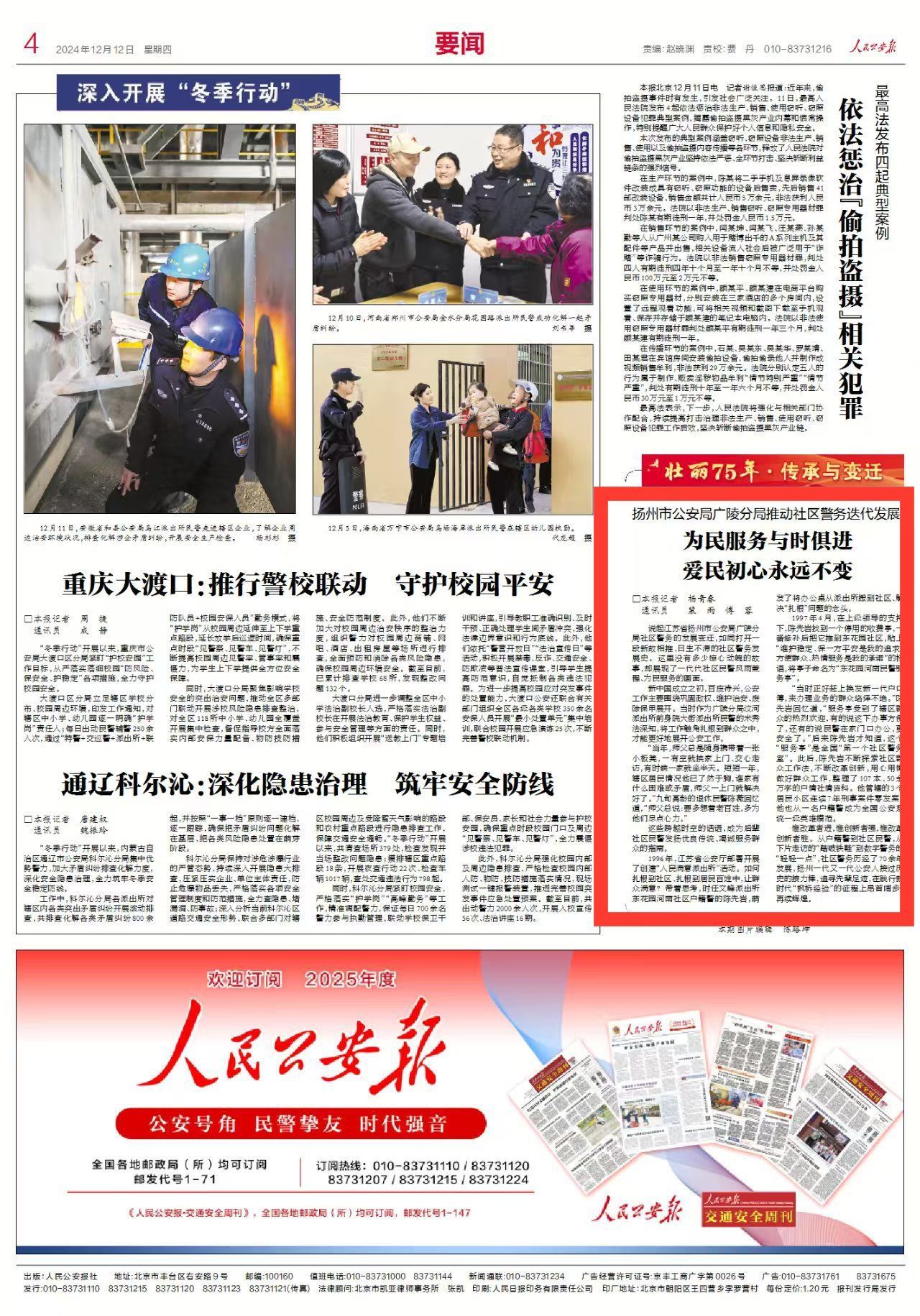 12月12日出版的《人民公安报》以《为民服务与时俱进 爱民初心永远不变》为题,报道了江苏省扬州市公安局广陵分局社区警务的发展变迁,如同打开一段新故相推、日生不滞的社区警务发展史。这里没有多少惊心动魄的故事,却展现了一代代社区民警风雨兼程、为民服务的画面。现全文转发,以飨读者。