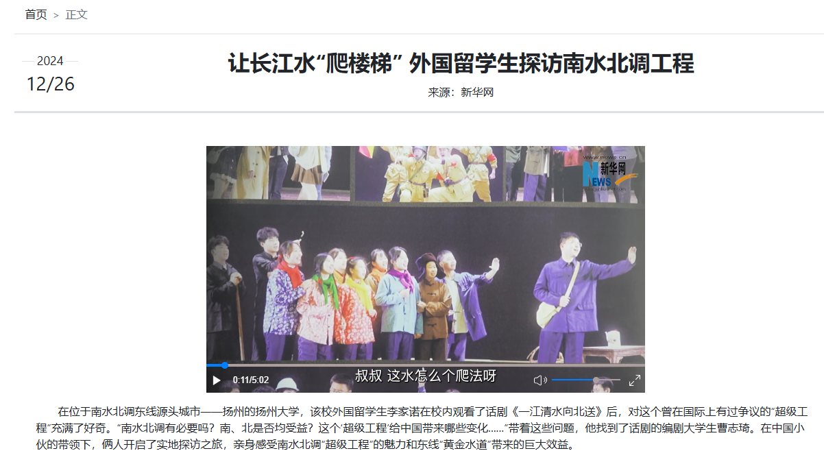 “叔叔,这水怎么个爬法呀?”12月26日,在位于南水北调东线源头城市——扬州的扬州大学内,该校外国留学生李家诺在校内观看了话剧《一江清水向北送》后,对这个曾在国际上有过争议的“超级工程”充满了好奇。他找到了话剧的编剧大学生曹志琦。在中国小伙的带领下,俩人开启了实地探访之旅,亲身感受南水北调“超级工程”的魅力和东线“黄金水道”带来的巨大效益。日前,新华网全程报道了南水北调这座“超级工程”给外国小伙带来的震撼。