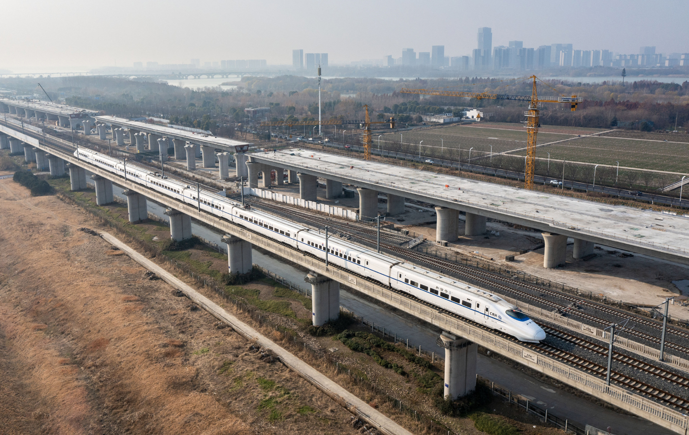 一列动车组列车行驶在连淮扬镇铁路扬州段。 新华社发(任飞 摄)