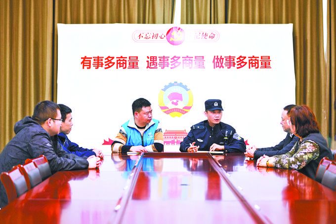 1月6日,扬州市公安局邗江分局汊河派出所民警和仲裁员化解复杂矛盾纠纷。冯晖摄