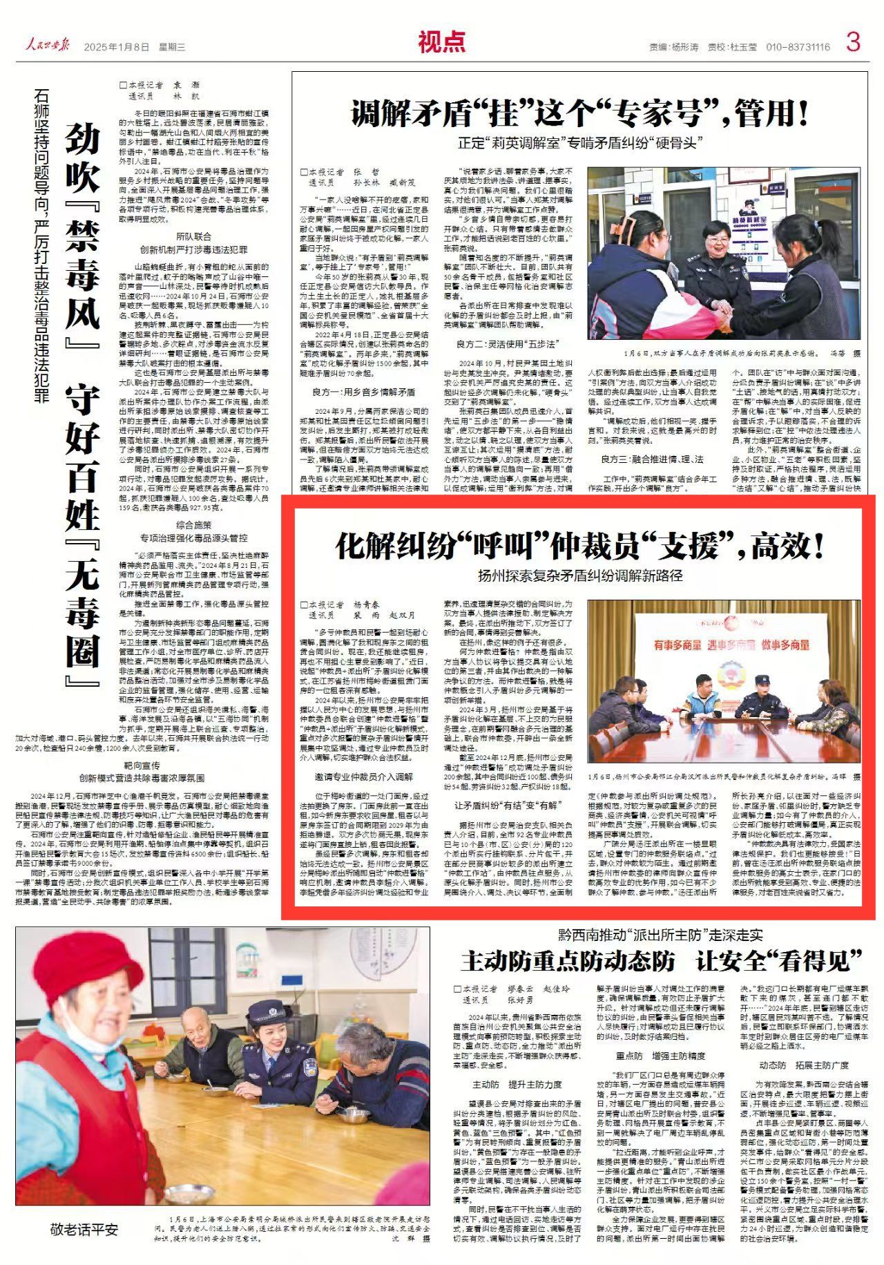 1月8日出版的《人民公安报》以《化解纠纷“呼叫”仲裁员“支援”,高效!》为题,报道了扬州市公安局与扬州市仲裁委员会联合创建“仲裁进警格”暨“仲裁员+派出所”矛盾纠纷化解新模式,对多次报警的复杂矛盾纠纷警情开展集中攻坚调处,通过专业仲裁员及时介入调解,切实维护群众合法权益。扬州发布现全文转发,以飨读者。