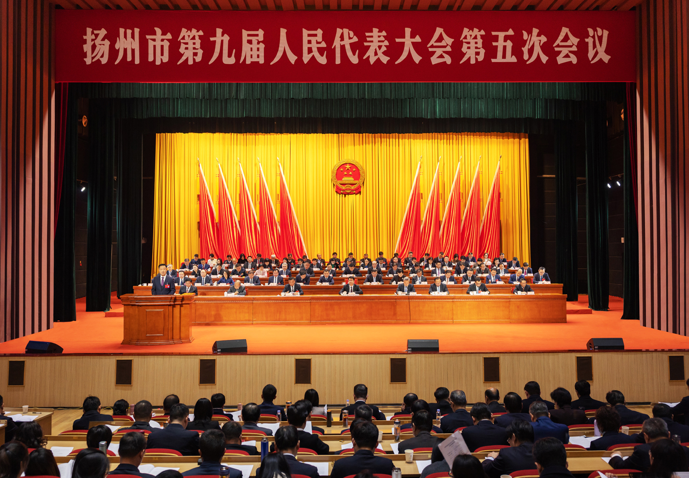 扬州网讯 (记者 吴涛 伊然 洁文) 1月12日上午10时,在庄严的国歌声中,扬州市第九届人民代表大会第五次会议在会议中心隆重开幕。肩负使命与重托、满怀憧憬与期待,来自全市各行各业、各条战线的市人大代表以饱满的政治热情出席大会。