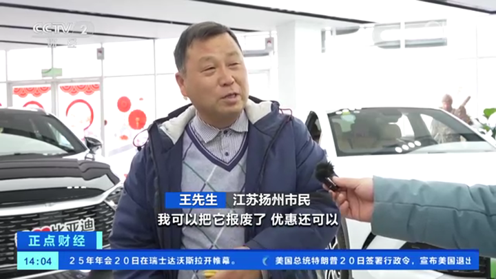 扬州市民王先生:“现在车辆年份到了,有新的政策出来,我可以把它报废了,优惠还可以。”