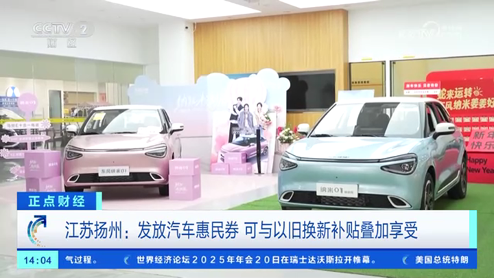 1月21日,央视《新闻直播间》《正点财经》栏目分别以《江苏扬州:发放千万汽车惠民券 叠加最高补贴2.5万元》、《江苏扬州:发放汽车惠民券 可与以旧换新补贴叠加享受》为题,聚焦扬州发放千万汽车惠民券。