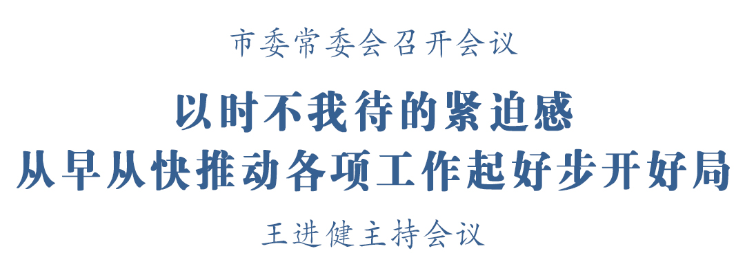 会议研究了2月份全市重点工作、1月份重点工作完成情况。会议指出,2月份是开启全年工作的关键之时,也是实现首季“开门红”的关键月份。各地各部门要以时不我待的紧迫感,从早从快推动各项任务落地落实,全力以赴推进各项工作起好步、开好局。要抓好省市两会精神学习贯彻。围绕省委、市委最新明确的目标任务,不折不扣抓推进。要全力以赴起跑争先。激发消费潜能,扩大有效投资,稳定外资外贸,不断巩固经济回升向好的态势。要用心用情保障民生。聚焦民生关切,加强市场保供、欠薪治理、困境救助、就业保障,确保广大群众温暖过冬、祥和过节。要坚决维护安全稳定。加强烟花爆竹等重点领域监管,提前做好雨雪寒潮等极端天气防范应对,全力维护春节假期以及全国两会期间社会稳定。要持之以恒正风肃纪。严格执行节日期间廉洁自律各项规定要求,合力营造风清气正的节日氛围。