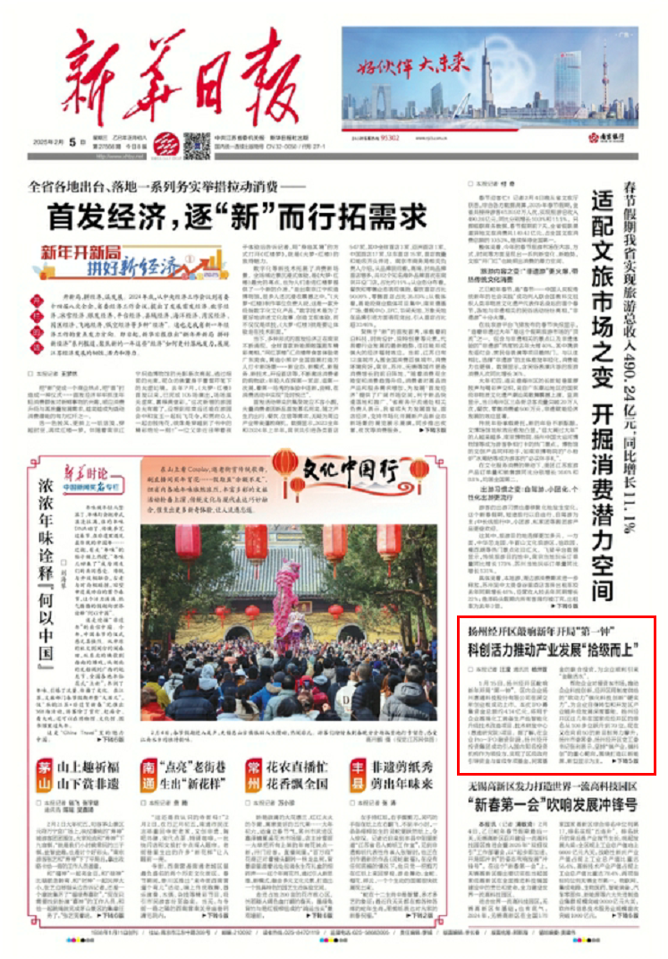 2月5日,《新华日报》头版刊发题为《科创活力推动产业发展“拾级而上”》的文章,扬州发布现全文转发,以飨读者。