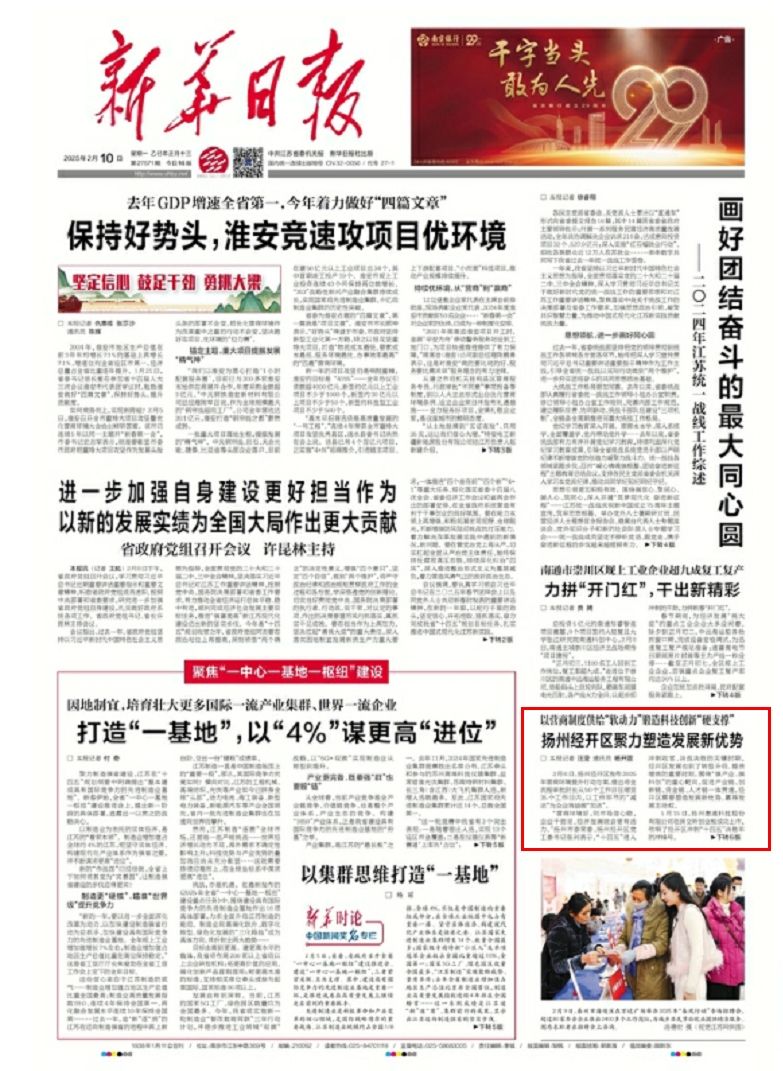 2月10日,《新华日报》头版刊发题为《扬州经开区聚力塑造发展新优势》的文章,现全文转发,以飨读者。