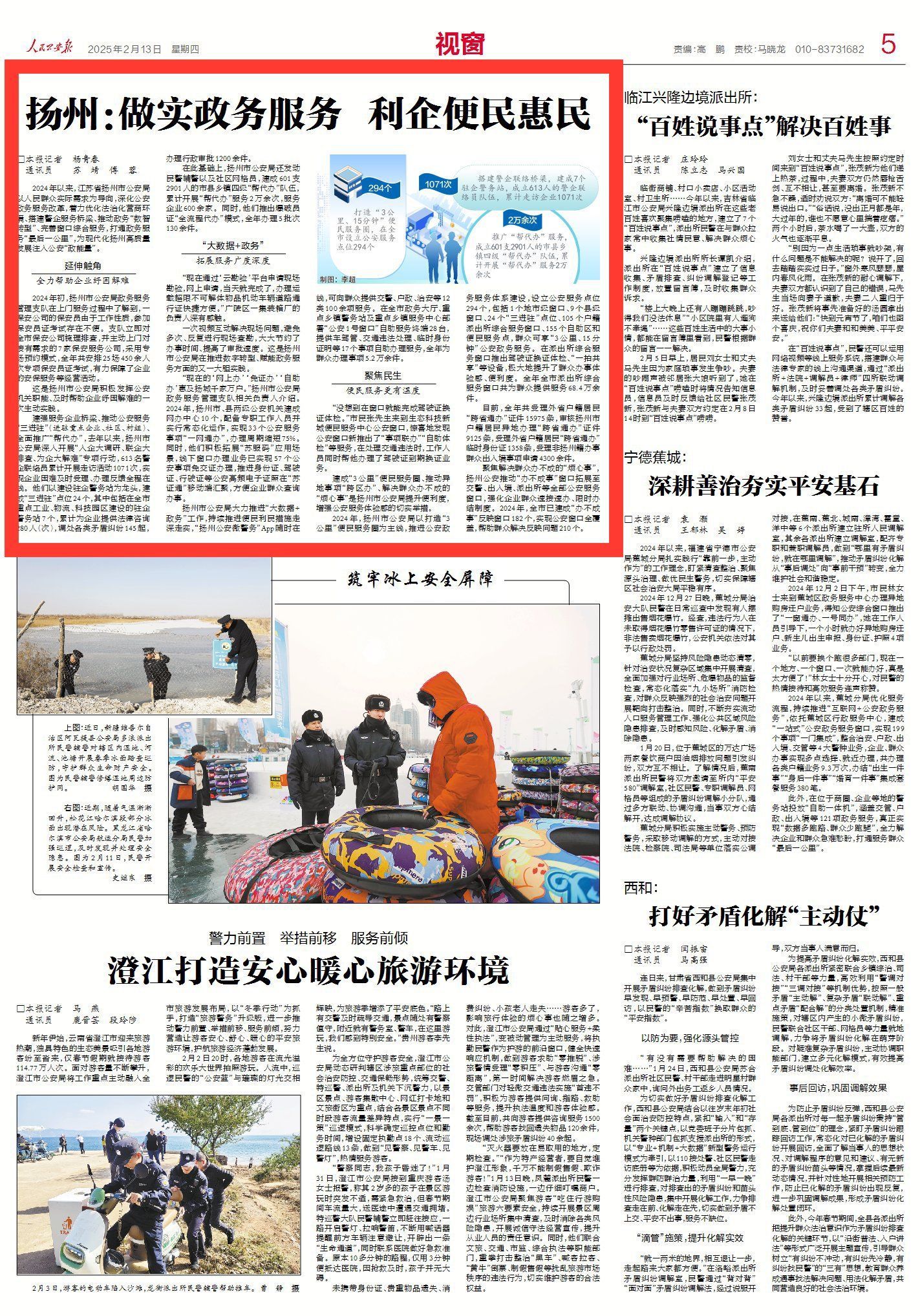 2月13日出版的《人民公安报》以《扬州:做实政务服务 利企便民惠民》为题,报道了2024年以来,江苏省扬州市公安局以人民群众实际需求为导向,深化公安政务服务改革,着力优化法治化营商环境、搭建警企服务桥梁、推动政务“数智转型”、完善窗口综合服务,打通政务服务“最后一公里”,为现代化扬州高质量发展注入公安“政能量”。现全文转发,以飨读者。