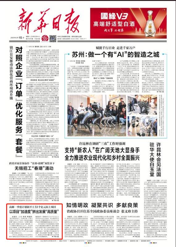 2月15日,《新华日报》头版刊发题为《以项目“加速度”拼出发展“高质量”》的文章,现全文转发,以飨读者。