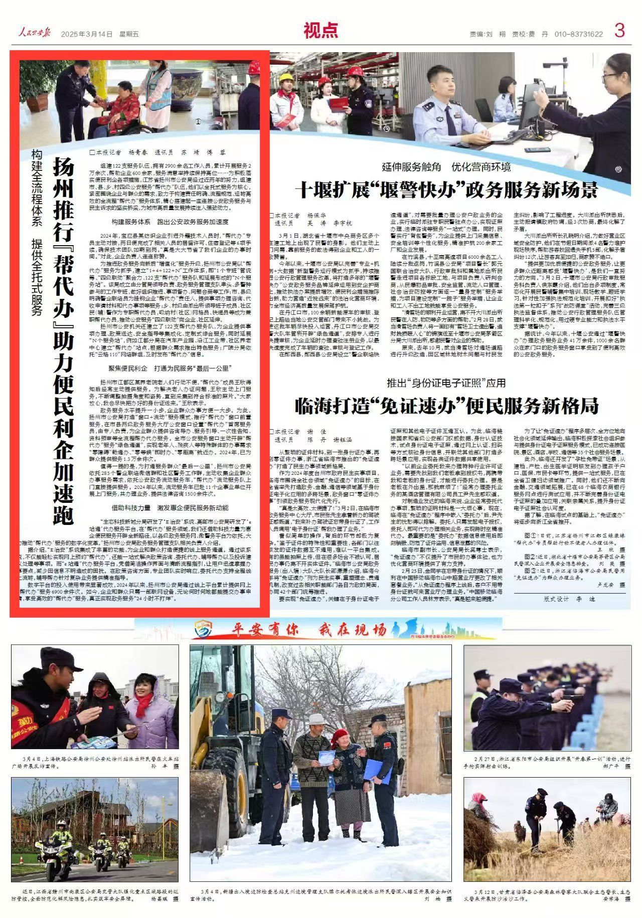 3月14日出版的《人民公安报》以《扬州推行“帮代办”助力便民利企加速跑》为题,报道了江苏省扬州市公安局经过近两年的努力,组建市、县、乡、村四级公安服务“帮代办”队伍,他们以全托式服务为核心,紧密围绕企业与群众的需求,致力于构建责任明确、流程规范、运转高效的全流程“帮代办”服务体系,精心搭建起一座连接公安政务服务与民生诉求的坚实桥梁,为城市高质量发展持续注入强劲动力。现全文转发,以飨读者。