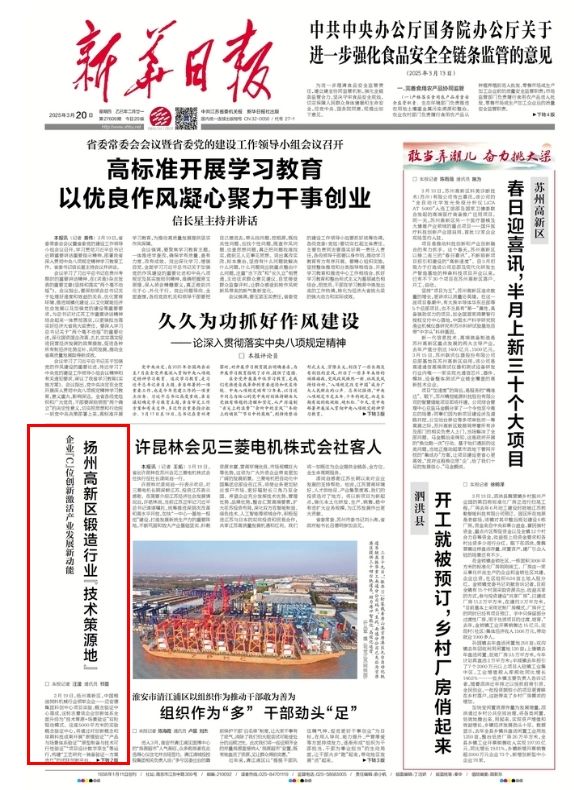 3月20日,《新华日报》头版刊发题为《扬州高新区锻造行业“技术策源地”》的文章,现全文转发,以飨读者。