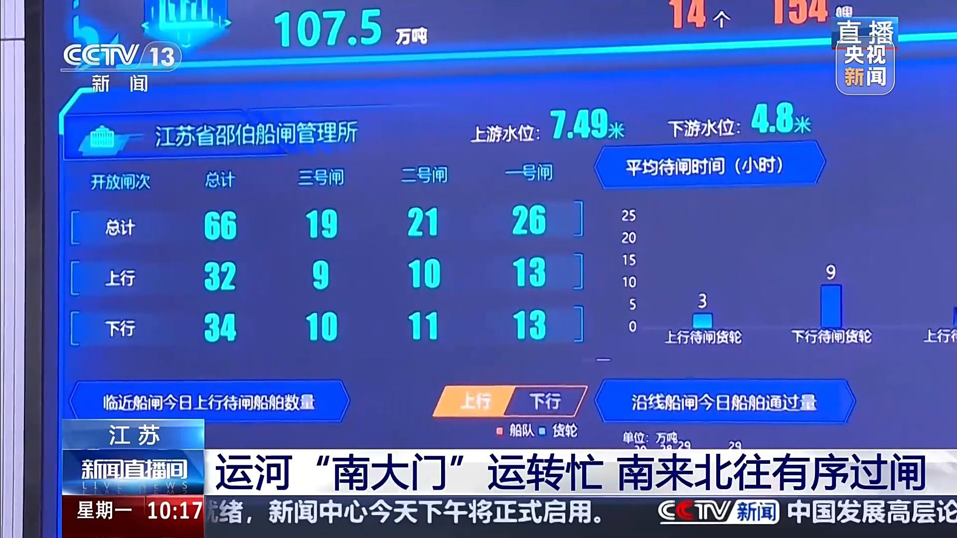 大屏幕上显示的是船闸智能调度系统和视频监控系统。南来北往的船只有不少都在停泊区等待过闸,已接到调度指令的船舶正在有序通过船闸。我们还能看到最新的上下行船舶通过量、船闸的开放闸次等等,能够很直观地看到整个施桥船闸是非常繁忙。工作人员告诉我,今年前两个月,施桥船闸的船舶通过量已经达到4796.2万吨,货物通过量4218.7万吨,而整个苏北段的货物通过量是同比增长了2.3%。