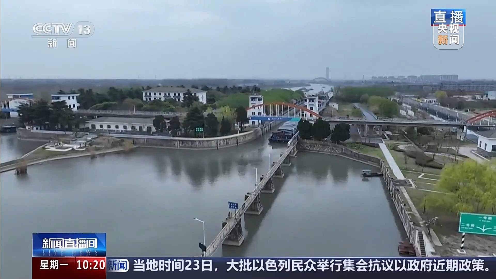 总台记者 秦睿迪:我现在所在的位置是苏北运河扬州运行调度中心。这个调度中心就建在苏北运河的施桥船闸区域。施桥船闸位于长江干线和京杭大运河的交汇处,是长江进入苏北运河后的第一个航运枢纽,素有苏北运河“南大门”之称。