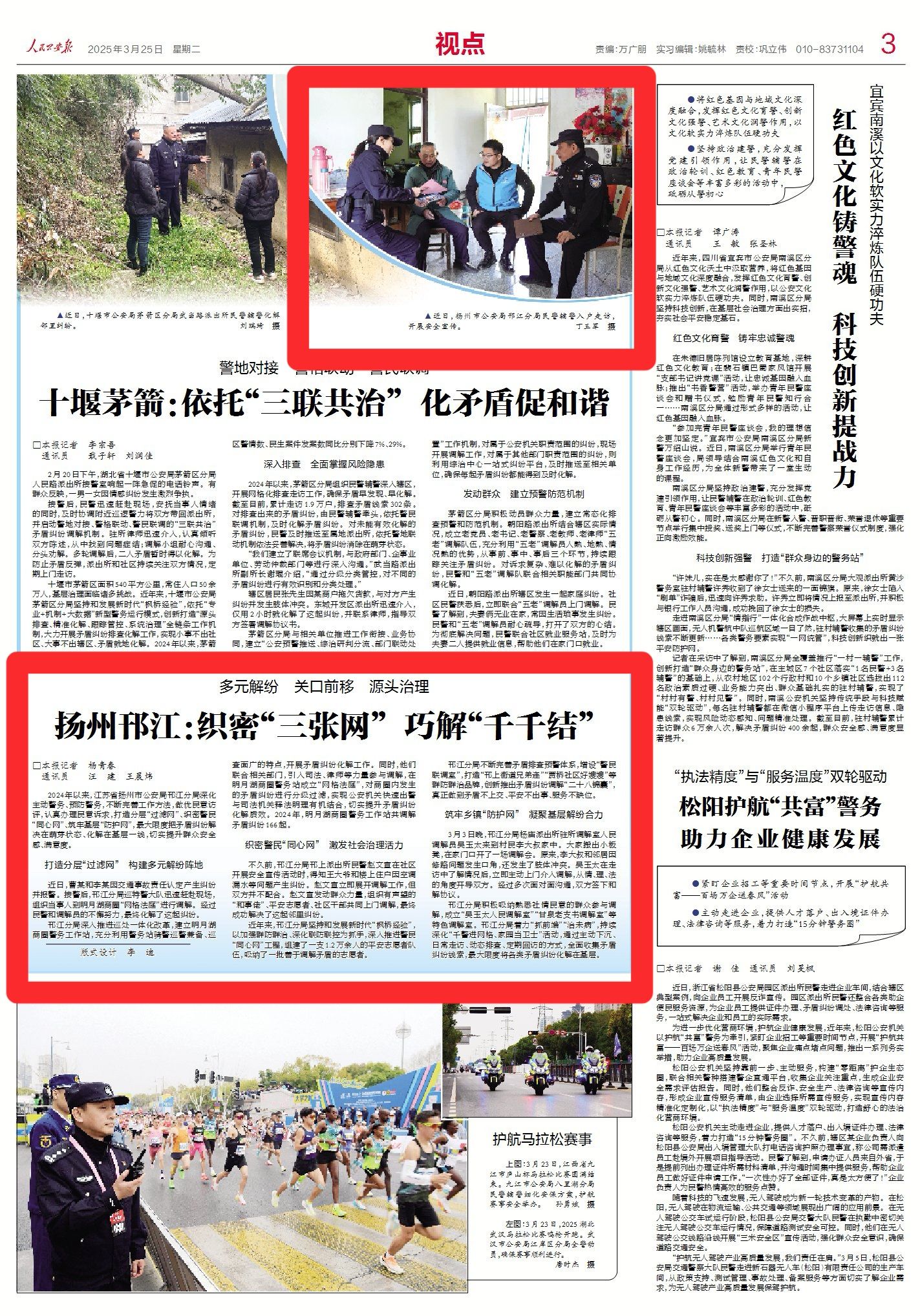 3月25日出版的《人民公安报》以《扬州邗江:织密“三张网” 巧解“千千结”》为题,报道了扬州市公安局邗江分局深化主动警务、预防警务,不断完善工作方法,做优民意访评,认真办理民意诉求,打造分层“过滤网”、织密警民“同心网”、筑牢基层“防护网”,最大限度把矛盾纠纷解决在萌芽状态、化解在基层一线,切实提升群众安全感、满意度。现全文转发,以飨读者。