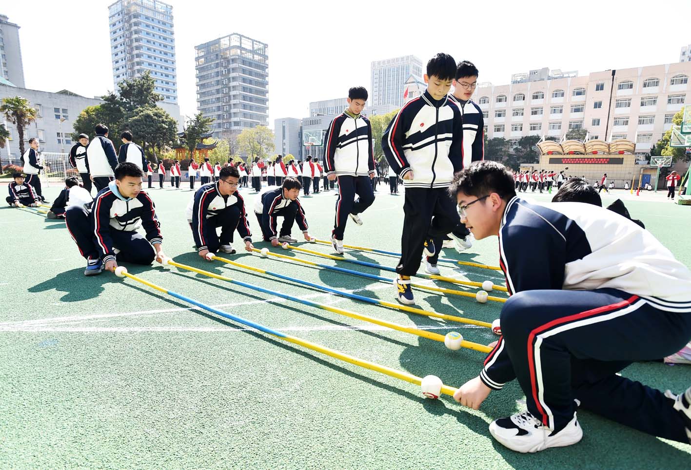 随着春季气温逐渐攀升,邗江区实验学校中学分校的操场上,尽是运动“撒欢儿”的身影。2025年春季开学以来,该中学分校结合省教育厅“2·15专项行动”,开展以“特色大课间,绽放青春活力”为主题的阳光体育系列活动。图为中学生在体验“竹竿舞”健身运动。 庄文斌 摄