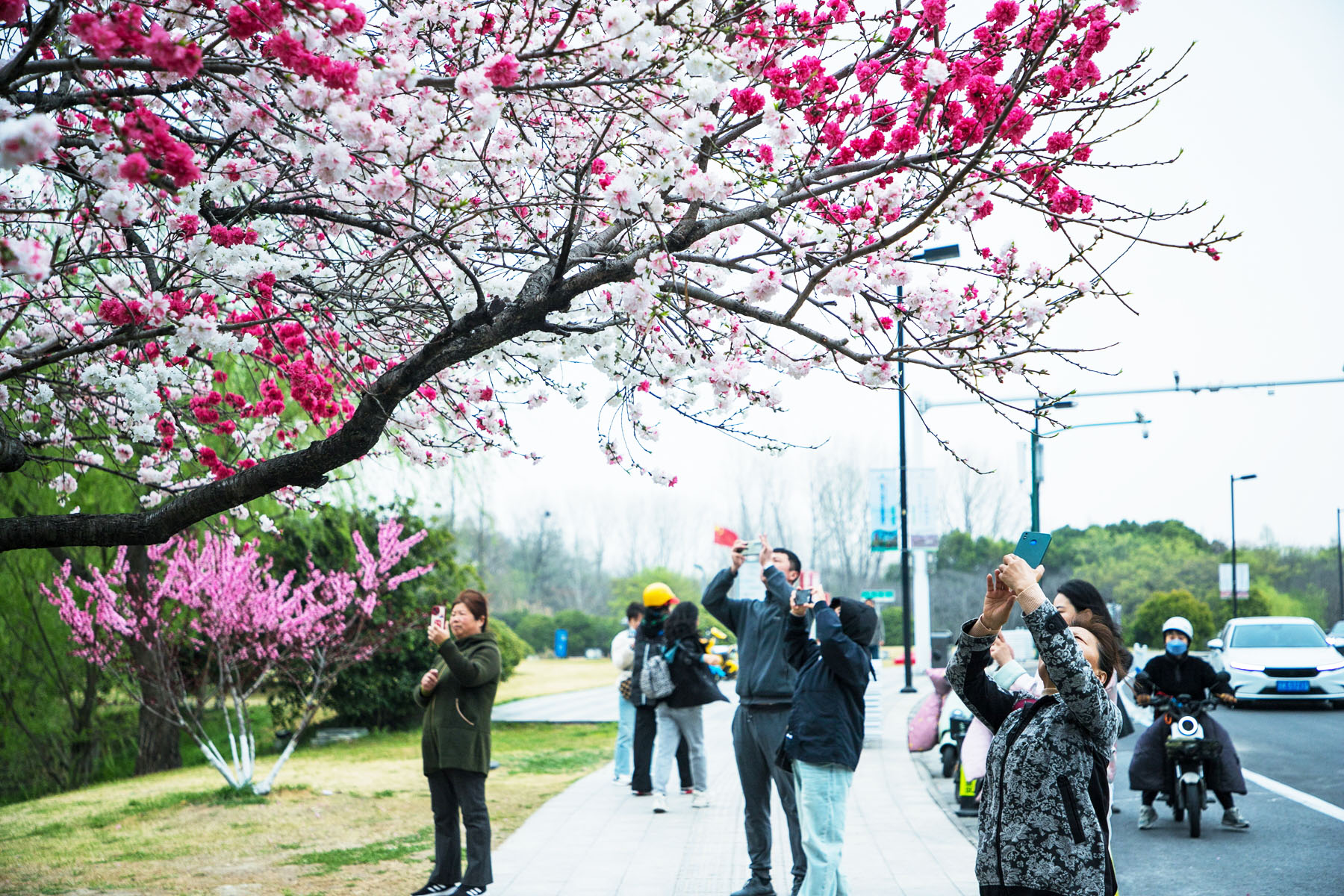 昨天,记者看到,位于平山堂东路与相别路交会处的四色洒金碧桃终于盛开啦!这棵“网红桃树”吸引了不少市民、游客驻足拍摄,只为记录下这一年一会的“限定美景”。