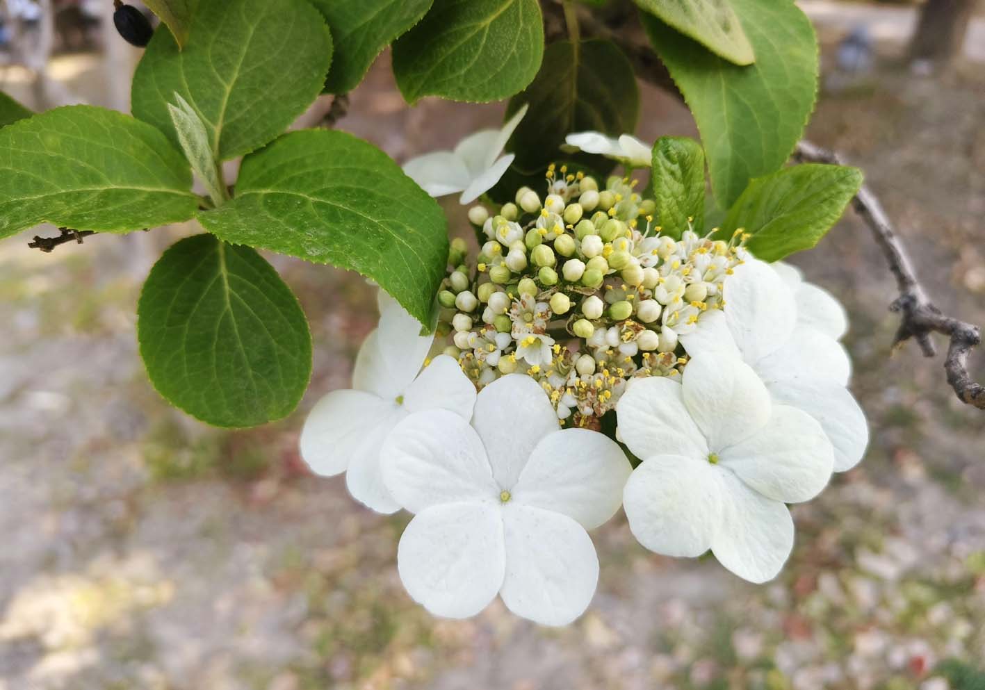 在扬州街头大批的琼花树开始开花,为古城扬州增添了春色。琼花又称“聚八仙”,每朵花大如玉盘,由八朵玉瓣小花簇拥着花蕊,花势中凸边平,呈馒头势,显椭圆形,像是八位仙子围坐品茗聚谈;香味清和,沁人心脾,给人以清新、幽静、明快之感。