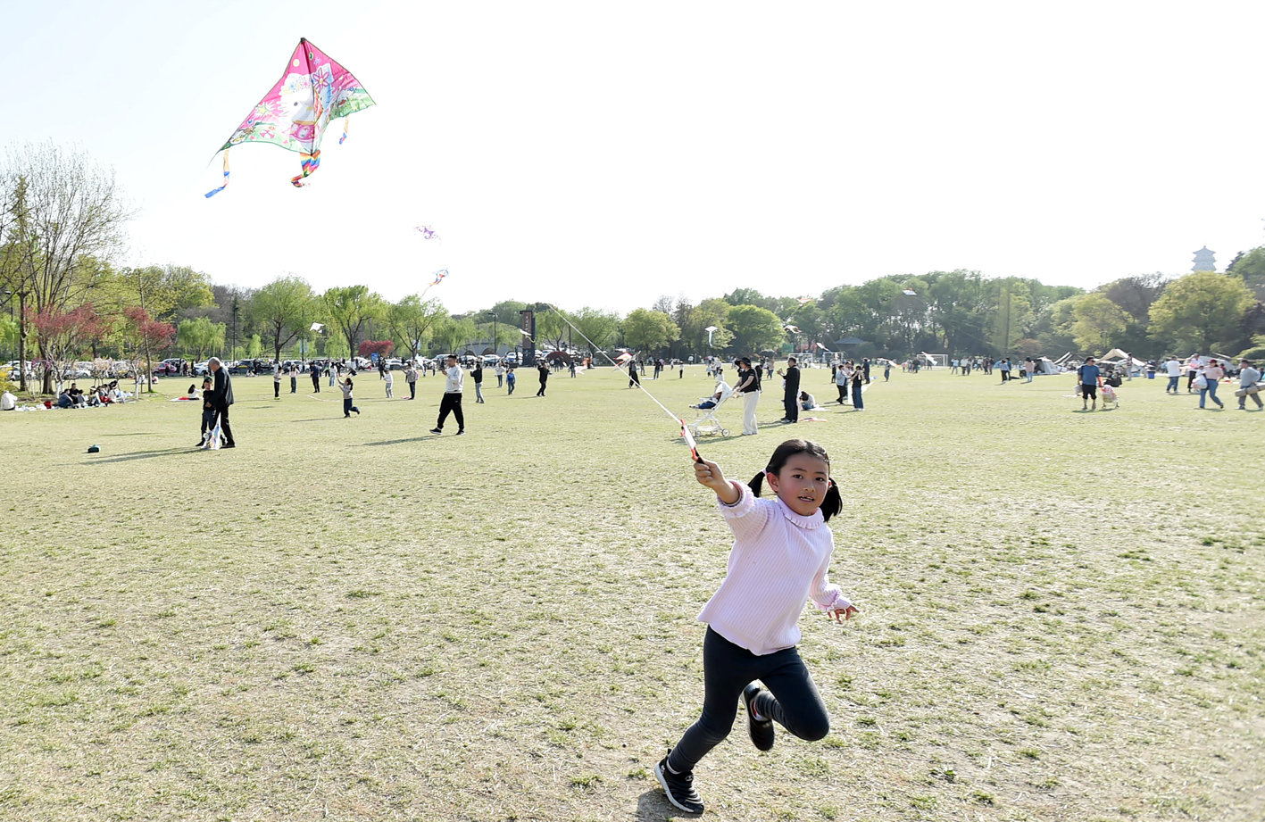 市民在保障河北侧的下马桥广场露营、放风筝。 庄文斌 摄