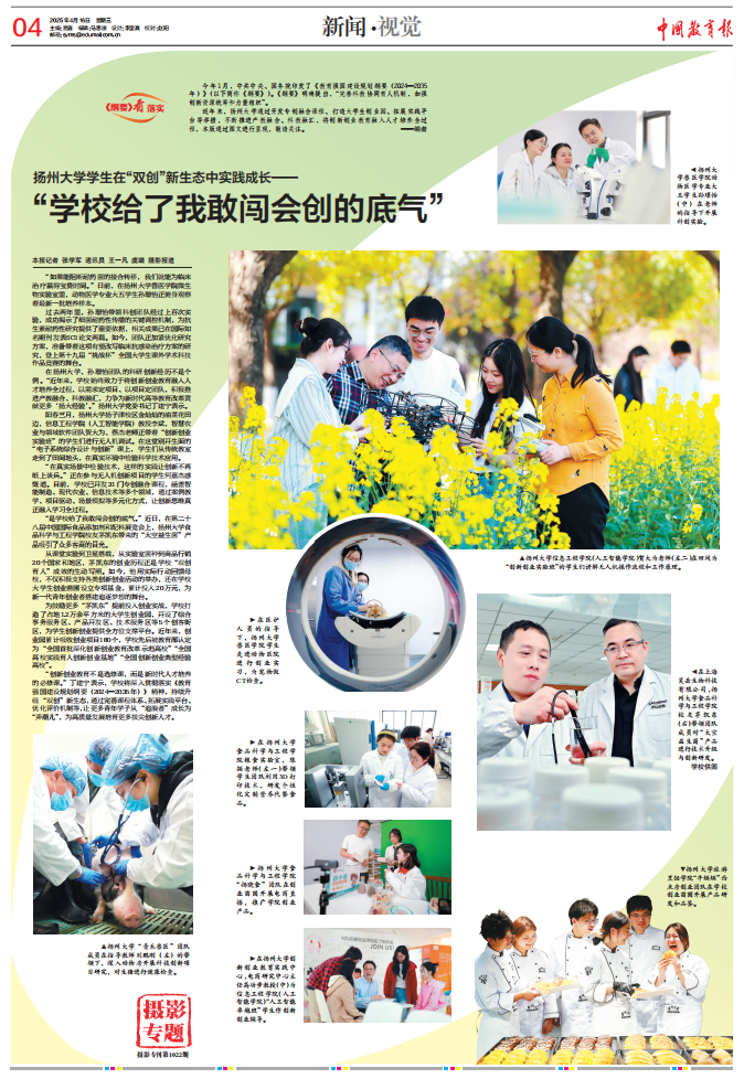 编者按:4月16日,《中国教育报》第4版整版刊发题为《扬州大学学生在“双创”新生态中实践成长—— “学校给了我敢闯会创的底气”》一文,以图文并茂的形式聚焦扬州大学“双创”人才培养。现全文转载,以飨读者。