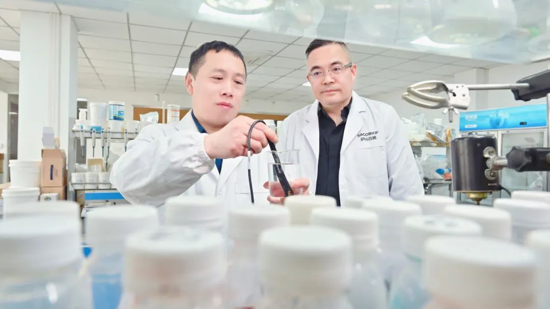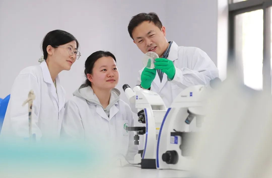 ▲在上海昊岳生物科技有限公司,扬州大学食品科学与工程学院校友茅凯东(右)带领团队成员对“太空益生菌”产品进行技术升级与创新研发。