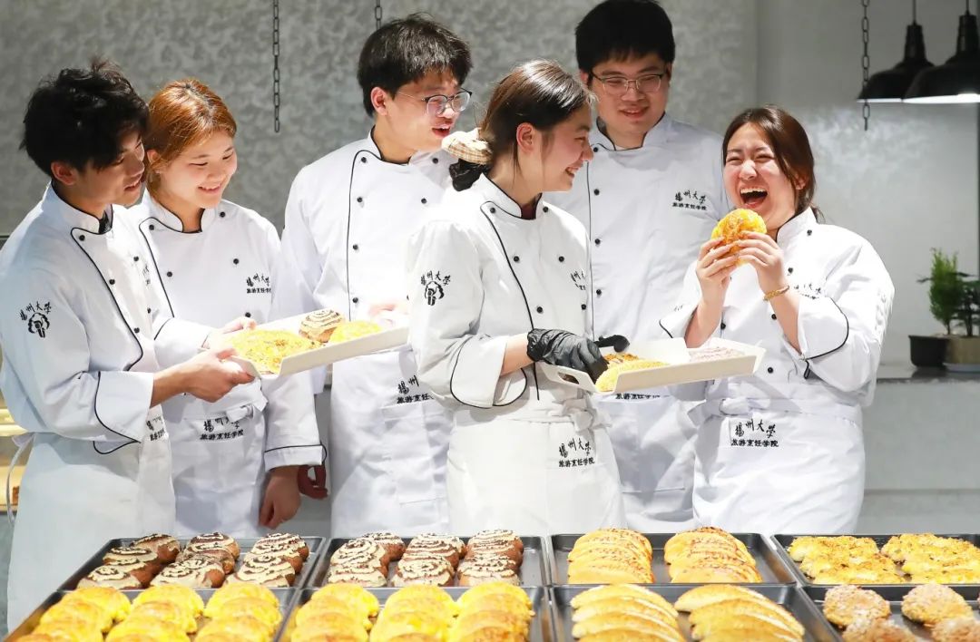 ▲扬州大学旅游烹饪学院“牛烘烘”西点房创业团队在学校创业苗圃开展产品研发和品鉴。