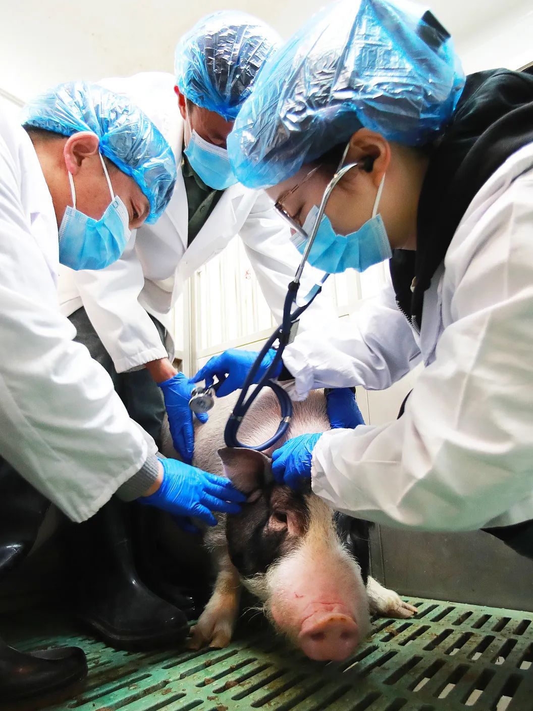 ▲扬州大学“青禾兽医”团队成员在指导教师刘鹏刚(左)的带领下,深入动物房开展科技创新项目研究,对生猪进行健康检查。
