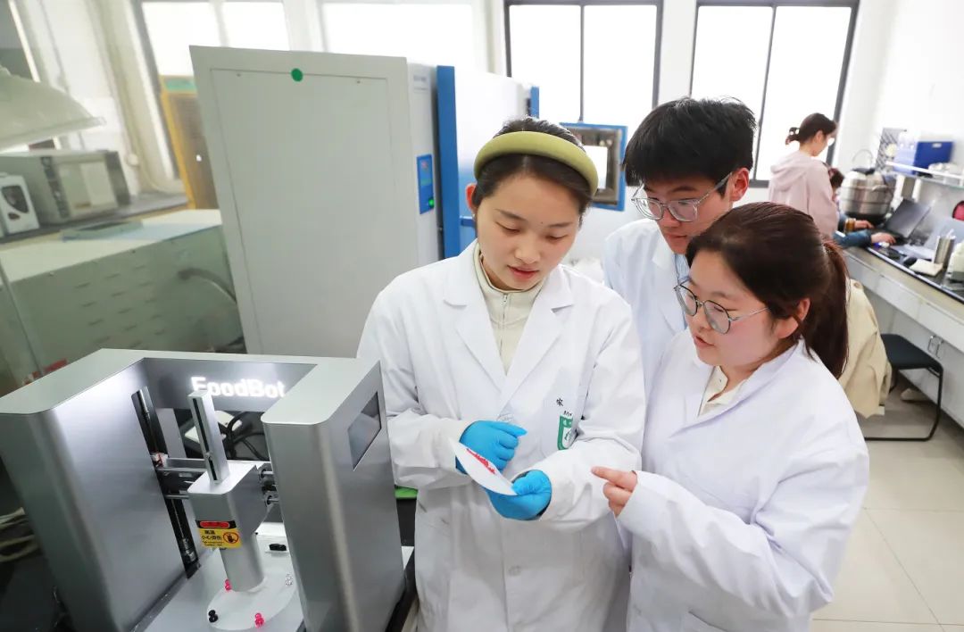 ▲在扬州大学食品科学与工程学院粮食实验室,陈颖老师(左一)带领学生团队利用3D打印技术,研发个性化定制营养代餐食品。