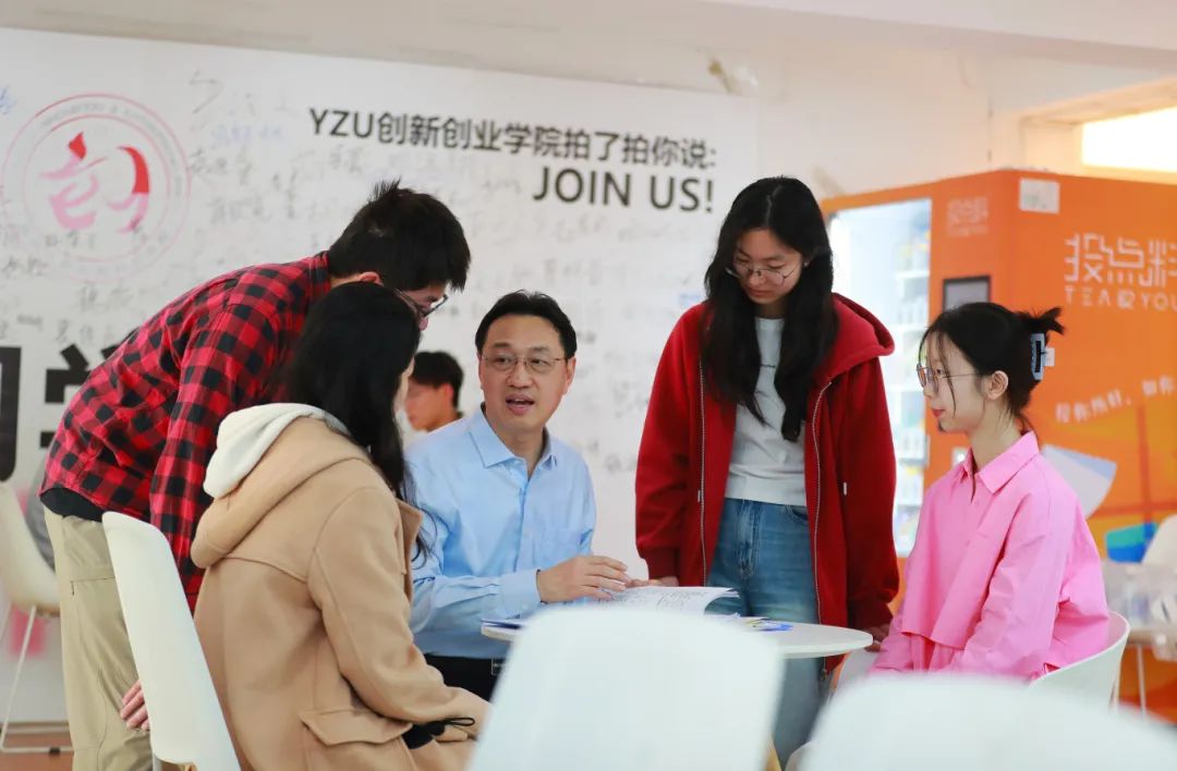 ▲在扬州大学创新创业教育实践中心,电商研究中心主任高功步教授(中)为信息工程学院(人工智能学院)“人工智能卓越班”学生作创新创业辅导。