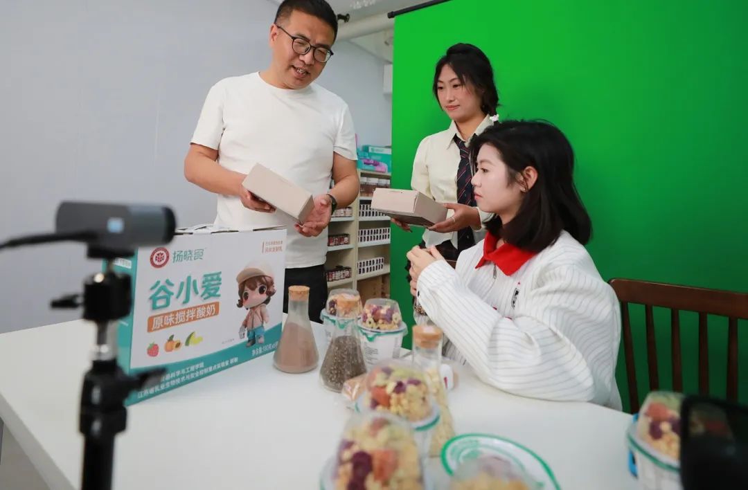 ▲扬州大学食品科学与工程学院“扬晓食”团队在创业苗圃开展电商直播,推广学院创业产品。
