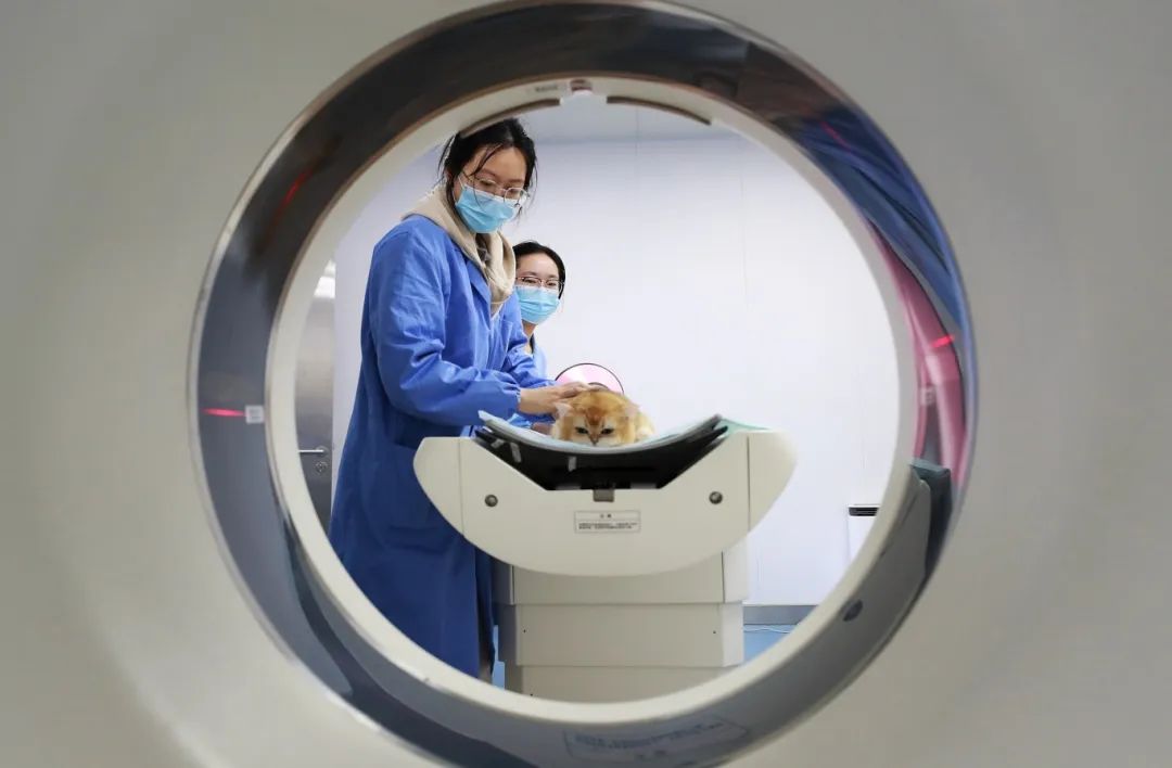 ▲在医护人员的指导下,扬州大学兽医学院学生走进动物医院进行创业实习,为宠物做CT检查。