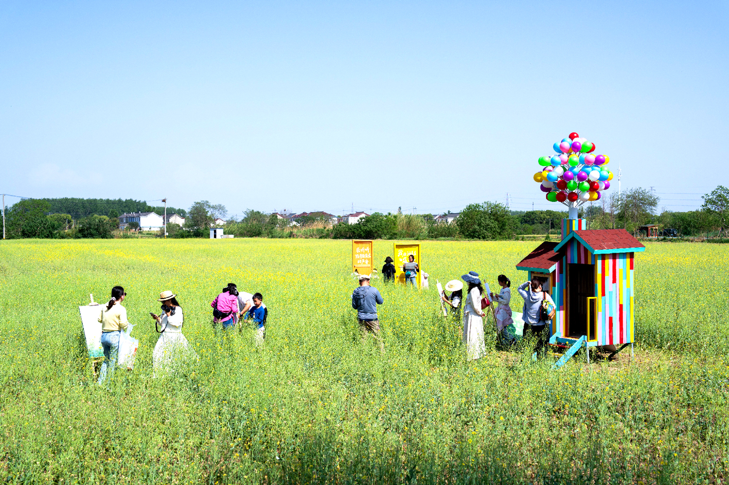 生态科技新城的五月油菜花海,则呈现出另一番热烈图景。半逻小筑的落地窗前,6岁女孩甜甜举着非遗绒花油菜花蹦跳,她的妈妈则迅速按下快门——窗外,金色花浪与粉墙黛瓦的农舍构成明丽色块,一杯油菜花蜜特调咖啡在前景中氤氲着热气。