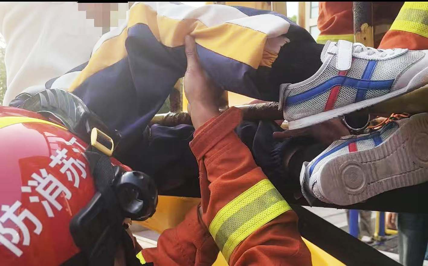 消防救援人员抵达现场后发现,被卡的是一名小男孩,此时他的左腿被一个金属滑梯的栏杆死死卡住,无法动弹。