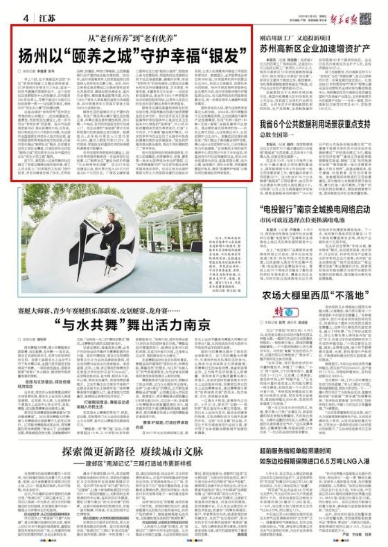 5月9日,《新华日报》刊发题为《扬州以“颐养之城”守护幸福“银发”》的文章。现全文转发,以飨读者。