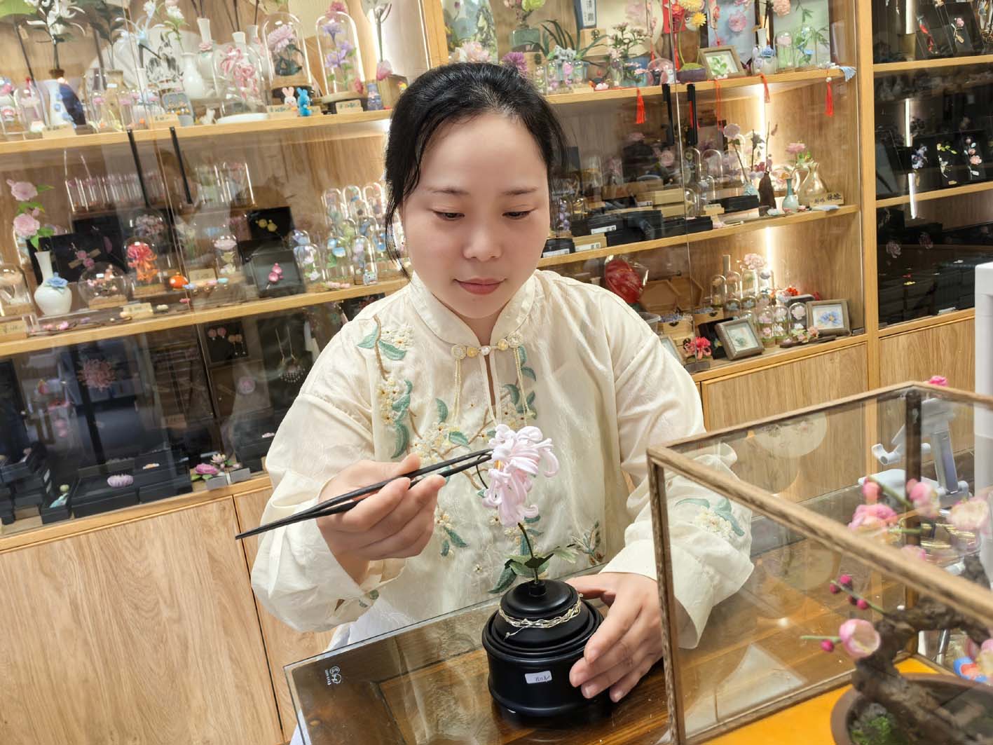 崔芳凝说,她们还针对年轻群体推出微缩盆景艺术,搭配玻璃罩与人物摆件,打造诗意“掌上花园”。这种“非遗+”模式成效显著:旅游旺季日均接待游客超300人次,胸针、微盆景成为热门伴手礼,本地居民购买率持续上升。
