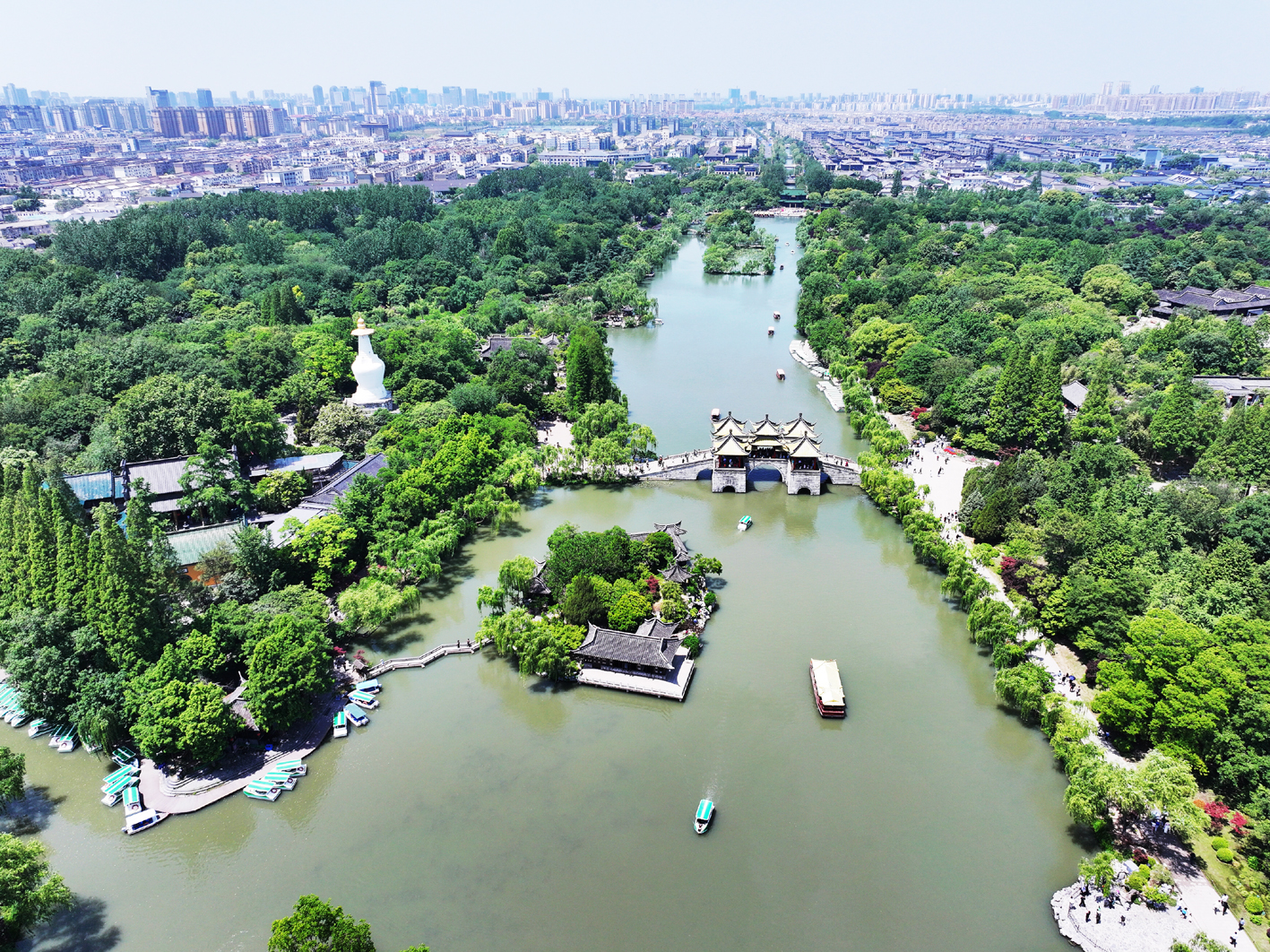 今天是中国旅游日,瘦西湖、个园、何园等全市国有A级旅游景区对市民和游客免费开放(不含园内收费及夜游项目),诚邀市民、游客共赴“诗画扬州”之约。图为初夏时节,瘦西湖绿意葱茏,景色宜人。 孟德龙 摄