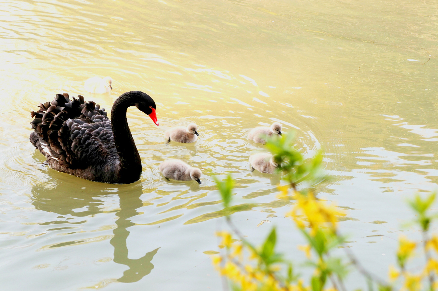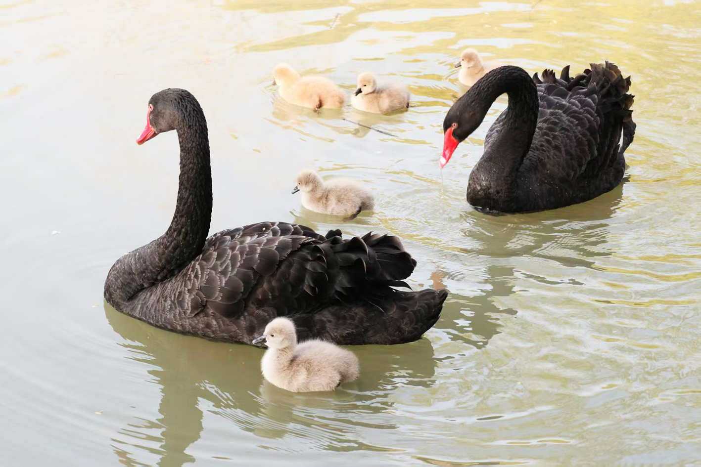 昨日傍晚,笔者在瘦西湖畔偶遇黑天鹅夫妇带着刚出生的5只小宝宝戏水玩耍。夕阳下,天鹅宝宝萌态可掬,在鹅爸鹅妈的呵护下尽情游动,吸引了众多游人驻足观赏、拍照。