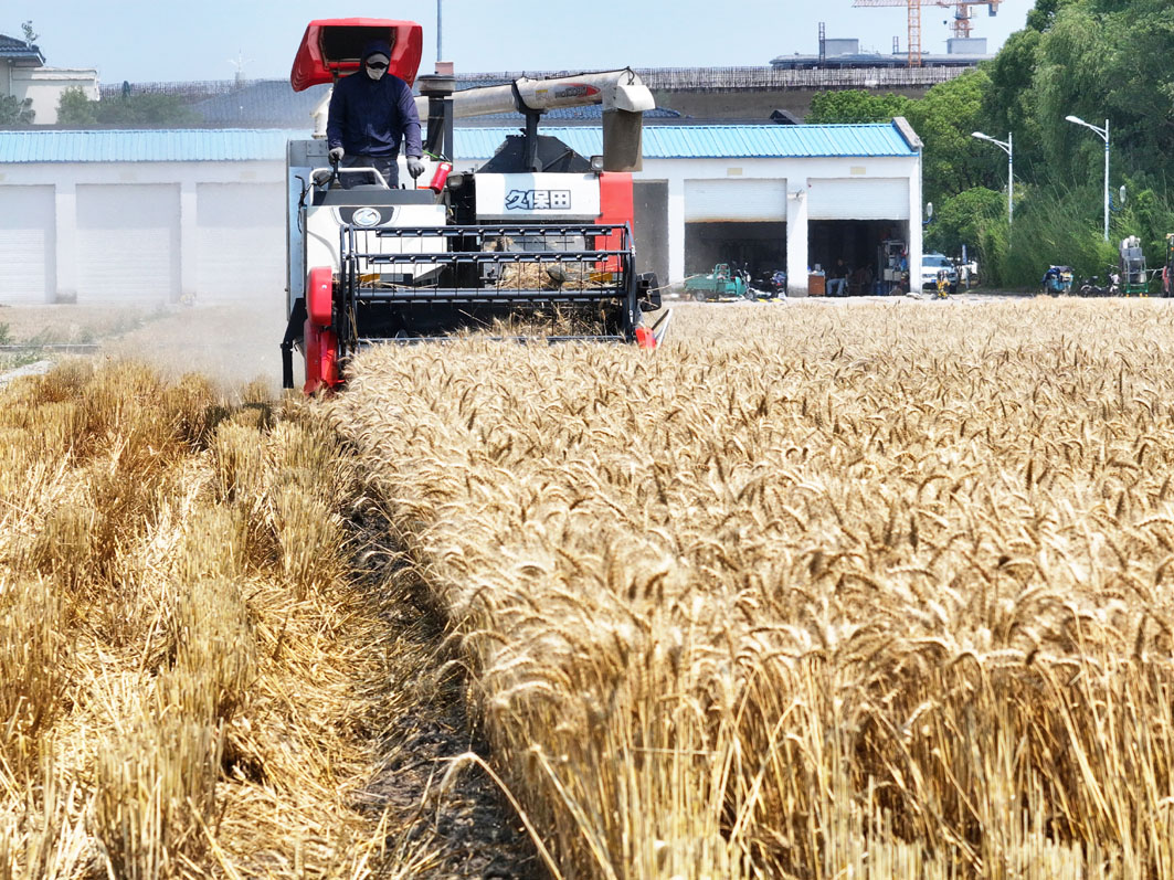 江苏里下河地区农科所(扬州市农科院)的小麦陆续进入收获期,农民抓住天气晴好有利时机抢收小麦,一派繁忙景象。 孟德龙 摄