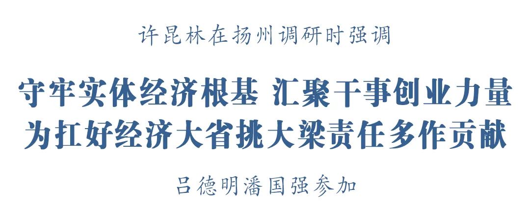 昨天,省长许昆林到扬州市调研。他强调,要深入学习贯彻习近平总书记对江苏工作重要讲话精神,按照省委十四届九次全会部署要求,守牢实体经济这个根基,以“打头阵”的使命担当狠抓科技创新和产业创新融合,因地制宜发展新质生产力,推动高质量发展持续向新向好,为扛好经济大省挑大梁责任多作贡献。省政府秘书长吕德明、市长潘国强参加。