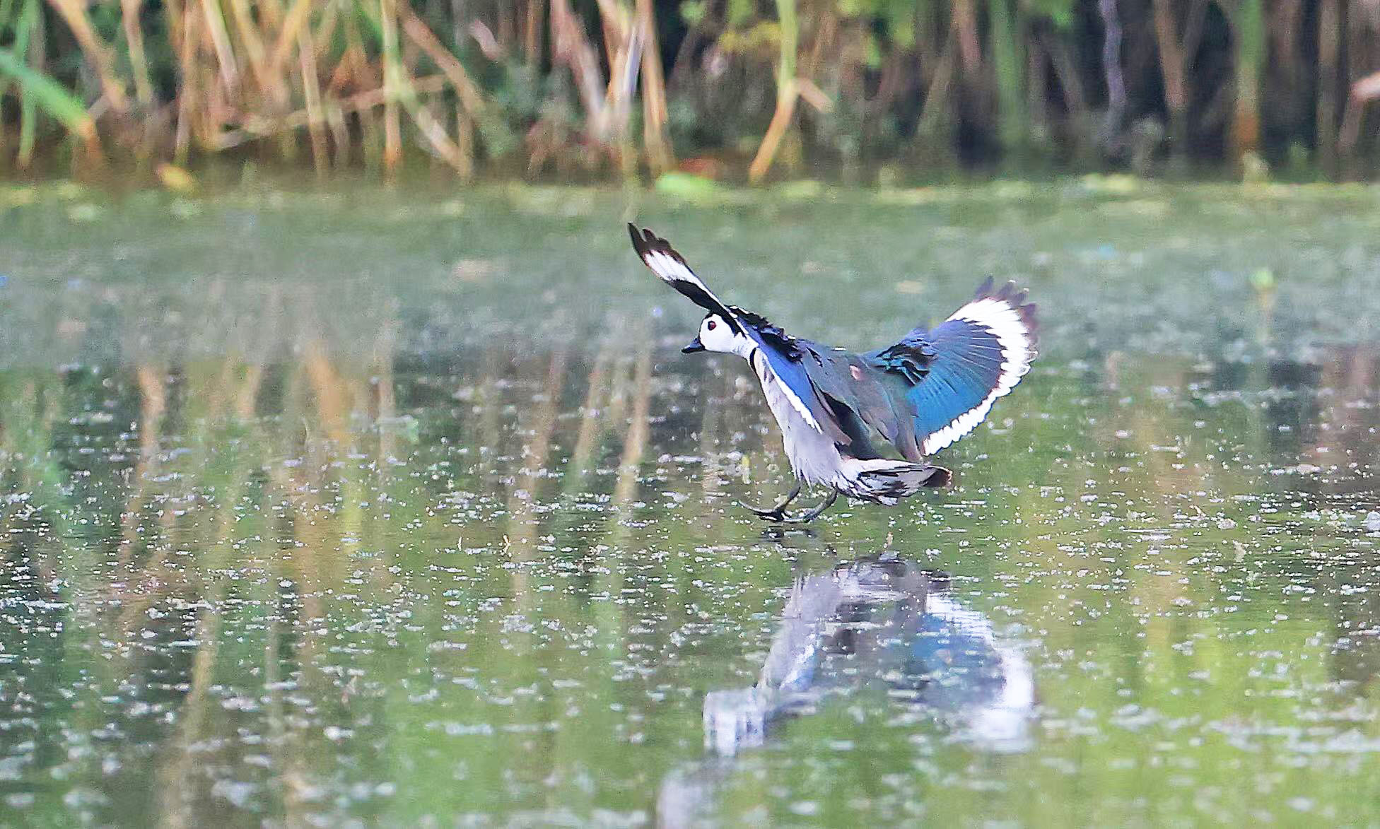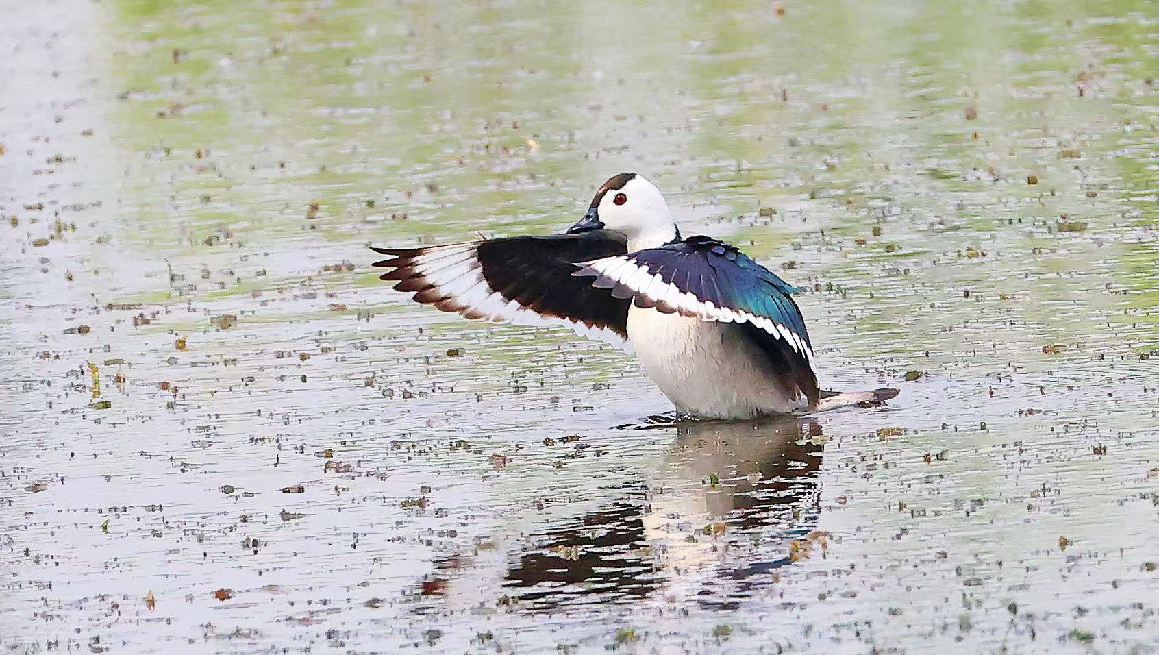 日前,世界最小野鸭——棉凫现身邵伯湖畔。棉凫是夏候鸟、国家二级保护动物,以白色羽毛居多而得名。雄棉凫在繁殖期间,其翅膀现蓝色金属光泽,十分美丽。